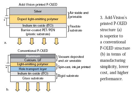 Add-Vision的印刷P-OLED技術提供了許多主流OLED具有的有吸引力的特性,但制造更容易、成本更低。該公司開發出一種混配的P-OLED LEP墨水,它是把LEP與添加劑和輸送材料進行特殊摻混和配制得到的。
