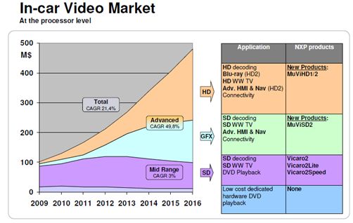 除了IDB-1394或者MOST等車內(nèi)多媒體的網(wǎng)絡(luò)技術(shù),車用的視頻處理器SoC市場也將在未來的數(shù)年內(nèi)呈現(xiàn)高速增長,CAGR將達到21.4%,其中高端SoC的年平均增幅接近50%。NXP半導體汽車電子事業(yè)部的技術(shù)和應(yīng)用市場經(jīng)理徐偉杰表示,高端處理器能夠解碼高清和標清的視頻內(nèi)容、支持藍光格式、接收全球不同的數(shù)字電視信號,并且應(yīng)該具備高級的HMI和導航系統(tǒng)以及網(wǎng)絡(luò)聯(lián)接。而中端的產(chǎn)品應(yīng)該支持標清內(nèi)容的解碼、地面數(shù)字電視和DVD播放等。