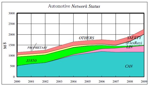 當前汽車總線主要包括用于車身控制的CAN、LIN,用作底盤控制的FlexRay和信息娛樂系統(tǒng)中的IDB-1394和MOST。CAN依然占據(jù)汽車總線的主流地位,但是英飛凌車身電子系統(tǒng)市場部經(jīng)理李世銘在IATF2009上表示,低速CAN的市場份額將會逐步被LIN所占領(lǐng)。