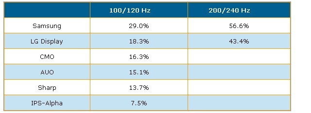 根據(jù)DisplaySearch調(diào)查指出,第二季全球采用倍頻及雙倍頻掃描技術液晶電視面板出貨達到640萬片,出貨量市占率達18.3%,較上一季提高2%。以廠商別來看,Samsung以29%市占率居100/120Hz出貨量排名冠軍,LG Display以18.3%是占率居次,CMO(奇美)、AUO(友達)、Sharp與IPS-Alpha分居第三到六名。在雙倍頻面板出貨量方面,主要為韓國二家面板廠商所主導,市占率如表二所示。