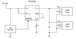 圖7是一種輸出限制電流可調(diào)節(jié)的USB端口電路。該電路由MIC2008作功率分配開關(guān),由USB控制器對功率分配開關(guān)實現(xiàn)控制。限定的電流由外設(shè)電阻R來設(shè)定(限制電流范圍為0.2~2.0A)。該功率分配開關(guān)的輸出電壓上升率(啟動時間)可由外設(shè)電容C來設(shè)定,內(nèi)部有過熱保護及輸入電壓過低時輸出鎖存保護。