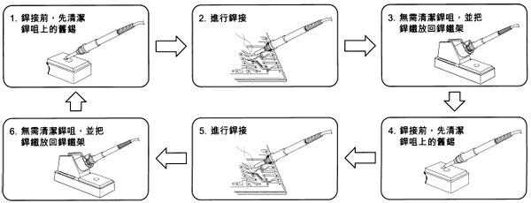 這可以減低烙鐵頭的氧化機會,使烙鐵頭更耐用。使用后,應待烙鐵頭溫度稍為降低后才加上新焊錫,使鍍錫層有更佳的防氧化效果。(圖5)