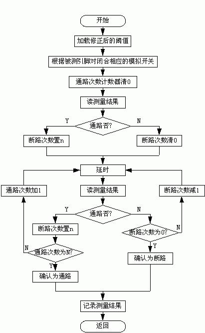 為了消除電容元件和模擬開關抖動的影響需要延長測量時間,而要消除電感元件的影響,則要利用感生電動勢在很短時間內確定,為此程序中設置了兩個計數器:通路次數計數器和斷路次數計數器。設置通路次數N是為了消除模擬開關閉合瞬間由于電容充電產生的假通路影響,即當累計讀得N次通路結果時,一般對電容的充電已結束,才確認被測量點間為通路。設置斷路次數n是為了排除模擬開關抖動所引起的干擾,一般在連續測得n次斷路結果時表明模擬開關的抖動已經結束,才能確認為斷路。但因為電感的感生電動勢在模擬開關閉合瞬間最大,隨后迅速下降,所以如果第一次和第二次測量結果都為斷路,則確認為斷路。由于幾種情況之間互相矛盾,計數器及延時的值是在權衡三種情況的基礎上根據實際情況確定的。