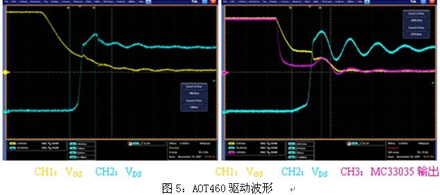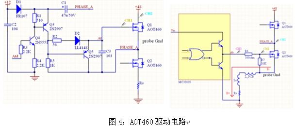 圖4是電動(dòng)車(chē)控制器的兩種驅(qū)動(dòng)MOSFET管AOT460驅(qū)動(dòng)電路,分立器件驅(qū)動(dòng)時(shí),PWM在上橋臂,直接用MC33035驅(qū)動(dòng)時(shí),PWM在下橋臂。