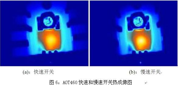 圖6為AOT460在同一應(yīng)用中快速開(kāi)關(guān)和慢速開(kāi)關(guān)情況下的熱成像照片。可以看出,在慢速開(kāi)關(guān)情況下MOSFET的局部溫度要高于快速開(kāi)關(guān)情況下的溫度,過(guò)慢的開(kāi)關(guān)速度會(huì)導(dǎo)致MOSFET因局部溫度過(guò)高而提前失效。