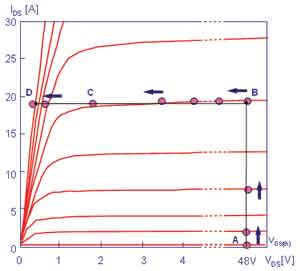 三極管有三個工作區:截止區、放大區和飽和區,MOSFET對應是關斷區、恒流區和可變電阻區。注意:MOSFET恒流區有時也稱飽和區或放大區。當驅動開通脈沖加到MOSFET的G和S極時,Vgs的電壓逐漸升高時,MOSFET的開通軌跡A-B-C-D如圖3中的路線所示。