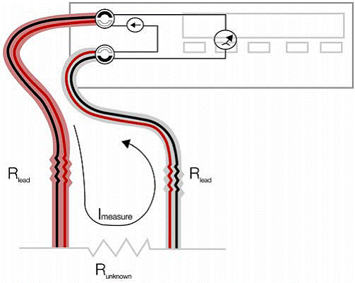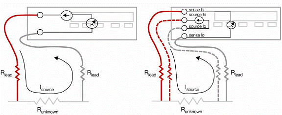 源端引線中的串聯(lián)電阻不影響電流流動。測量/傳感引線幾乎沒有電流流動,因為儀表的輸入阻抗很高。這意味著測量引線中沒有IxR電壓下跌。因此,您只需測量由于流經的源電流而在未知電阻器中產生的電壓下跌。
