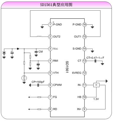另外,SD1561內置風扇堵轉保護和自動重啟電路,當監測到轉子被鎖死一段時間T秒時,自動停止風扇運轉10T秒,然后再進行T秒鐘的重新啟動,這種狀態會一直持續,直到風扇排除故障并正常運轉,這樣的保護模式可以防止風扇電機過熱燒毀,提高了系統的安全性。不同的風扇設計可以通過改變外部電容的大小來設置T。