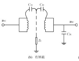 由于C2是屏蔽層的對地阻抗,在低頻范圍內,ZE《(1/jωC10),所以u2C→0。由此可見,采取屏蔽措施后,通過隔離變壓器的共模噪聲電壓被大大地削弱了。