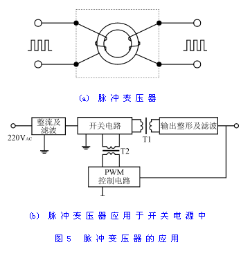 脈沖變壓器的匝數較少,而且一次繞組和二次繞組分別繞于鐵氧體磁芯的兩側,這種工藝使得它的分布電容特小,僅為幾個pF,所以可作為脈沖信號的隔離元件。脈沖變壓器傳遞輸入、輸出脈沖信號時,不傳遞直流分量,因而在微電子技術控制系統中得到了廣泛的應用。一般地說,脈沖變壓器的信號傳遞頻率在1kHz~1MHz之間,新型的高頻脈沖變壓器的傳遞頻率可達到10MHz。圖5(a)是脈沖變壓器的示意圖。脈沖變壓器主要用于晶閘管(SCR)、大功率晶體管(CTR)、IGBT等可控器件的控制隔離中。圖5(b)是脈沖變壓器的應用實例。