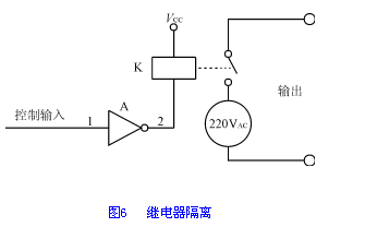 繼電器是常用的數字輸出隔離元件,用繼電器作為隔離元件簡單實用,價格低廉。圖6是繼電器輸出隔離的實例示意圖。在該電路中,通過繼電器把低壓直流與高壓交流隔離開來,使高壓交流側的干擾無法進入低壓直流側。