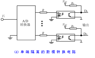 數模轉換(D/A)電路的隔離與模數轉換(A/D)電路的隔離類似,因而所采取的技術措施也差不多,圖7(d)是數模轉換(D/A)電路的隔離方法之一。