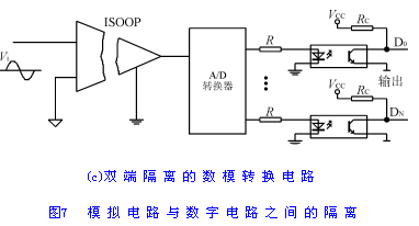 模擬電路與數字電路之間的隔離主要采用模/數轉換裝置;對于要求較高的電路,除采用模/數轉換裝置外,還應在模/數轉換裝置的兩端分別加入模擬隔離元器件和數字隔離元器件。