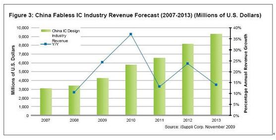 在金融危機影響下全球半導體業最新的預測是下降12%。在中國獨特的環境下按iSuppli的預測,2009年中國半導體市場下降6.8%及其設計業將增長24.2%,達到42億美元。這個數字占全球fabless約 500億美元的8%,及占中國半導體業銷售額,09年約1118億元的25.6%,可謂是取得不差的成績。