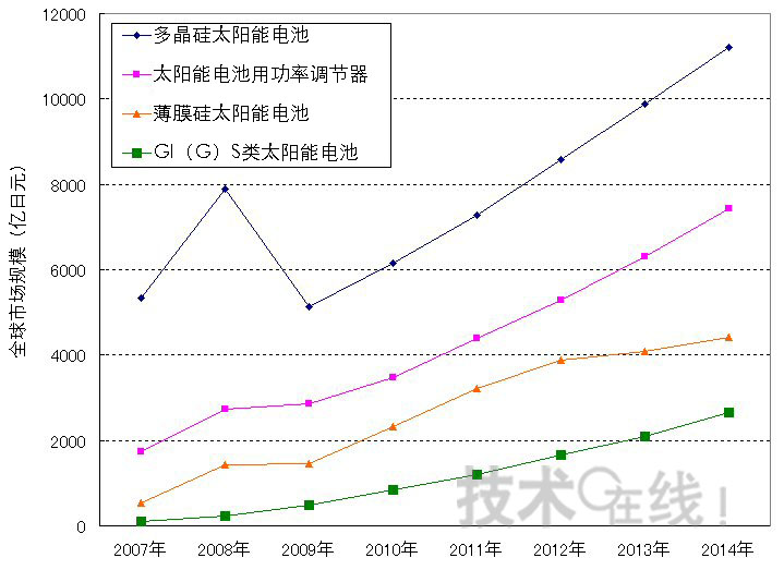 - 多晶硅太陽能電池的市場規模在2008年快速增長至7888億日元