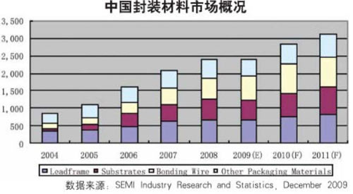 中國的半導(dǎo)體封裝材料市場在2009年將超過22億美元,比2008年增加1%左右。預(yù)計(jì)2011年達(dá)到31億美元。