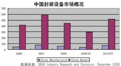 中國的封裝設(shè)備市場在2008年達(dá)到4.52億美元。受經(jīng)濟(jì)危機(jī)影響,中國封裝設(shè)備市場在2009年預(yù)計(jì)下滑34%左右,為3億美元。隨著中國封裝設(shè)備市場的快速成長,部分領(lǐng)先的設(shè)備商在中國設(shè)立了生產(chǎn)線。然而本土封裝設(shè)備占中國市場份額不足15%且主要應(yīng)用于低端市場。