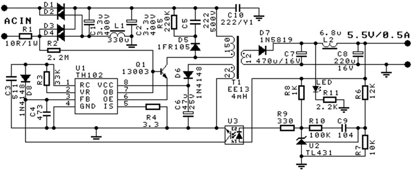 TH102零負載功耗包括:高壓啟動電阻(圖2、圖3中R2)靜態功耗,約30mW左右;開關功率管開關損耗;磁復位損耗,圖2、圖3采用RCD電路(圖中R5、C5、D5)損耗較大,若采用齊納二極管磁復位電路能降低損耗,但成本較高;開關變壓器開關損耗;TH102工作損耗;和輸出反饋損耗;按圖2、圖3方案,零負載功耗小于0.3W,圖中D8在零負載和小負載時將增大開關周期,減小開關功率管開關損耗。