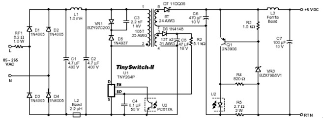 TNY264采用穩壓管、光耦發射二極管為輸出電壓基準和光耦隔離反饋電路。