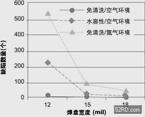 圖3是焊點(diǎn)不良與焊盤的寬度及組裝工藝的關(guān)系。這些數(shù)據(jù)是每種組裝工藝都選用最佳焊盤形式而得出的,試驗(yàn)時(shí)將焊盤的長度和焊盤間距設(shè)為常量,只對(duì)焊盤寬度進(jìn)行變化。通常來講,三種組裝工藝的良品率均隨焊盤寬度增大而提高,而不良率在焊盤寬度為0.012到0.015英寸之間較為敏感。水溶性焊膏在空氣環(huán)境中焊接和免清洗焊膏在充氮環(huán)境中焊接都是在焊盤寬度最大即0.018英寸時(shí)焊點(diǎn)缺陷最少,但這種情況在免清洗焊膏空氣環(huán)境下焊接時(shí)有一些改變,此時(shí)最高良品率是在焊盤寬度居中時(shí)(0.015英寸)得到的,然而由于使用這種工藝組裝的板子產(chǎn)生的不良數(shù)量非常少,所以焊盤寬度在0.015英寸和0.018英寸時(shí)不良數(shù)目之間的差異在統(tǒng)計(jì)上并不明顯。如果從組裝工藝的角度來看良品率變化趨勢(shì),可以看到免清洗焊膏在空氣環(huán)境中焊接對(duì)焊盤寬度變化最不敏感,而免清洗焊膏在充氮環(huán)境下焊接工藝則對(duì)焊盤寬度變化最為敏感。