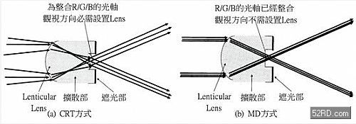 (圖四)(a)是傳統(tǒng)CRT背投電視螢?zāi)坏膭?dòng)作特性圖,由圖可知RGB各影像光線分別從相異方向投射到螢?zāi)唬?dāng)影像光線從螢?zāi)怀錾鋾r(shí)必需進(jìn)行光線整合,因此觀視方向的螢?zāi)槐砻嫱ǔ?huì)設(shè)置LenticularLens;圖四(b)是MD方式背投電視螢?zāi)坏膭?dòng)作特性圖,由圖可知它使用MD方式投影機(jī)投射影像,所以觀視方向的螢?zāi)槐砻娌恍柙O(shè)置LenticularLens。