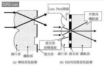事實(shí)上早期的MD方式RP-TV都是使用CRT背投電視螢?zāi)唬虼耸冀K無(wú)法充分發(fā)揮MD方式RP-TV的特性,有監(jiān)于此日本凸版印刷公司首度開(kāi)發(fā)如(圖五)所示MD方式RP-TV專用螢?zāi)唬蓤D可知MD方式RP-TV專用螢?zāi)坏腖enticularLens與遮光部各自獨(dú)立設(shè)置,尤其是遮光部設(shè)于擴(kuò)散部后面革命性設(shè)計(jì),使得該MD方式RP-TV專用螢?zāi)豢梢跃邆錁O佳的光學(xué)特性。