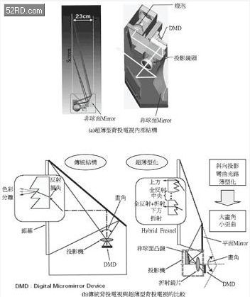 (圖三) (a)CRT背投電視的結(jié)構(gòu);(b)MD背投電視的結(jié)構(gòu)