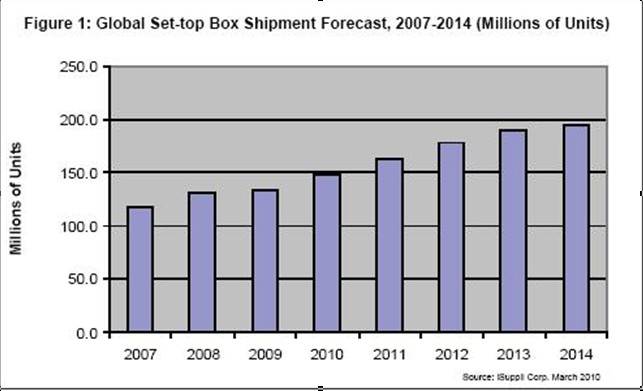 據iSuppli公司,機頂盒出貨量未來幾年將繼續增長。消費者收看模式發生轉變,通過互聯網提供的電視內容越來越流行,從而將為提供商創造條件,在數字家庭的激烈爭奪中獲得新的營業收入來源。