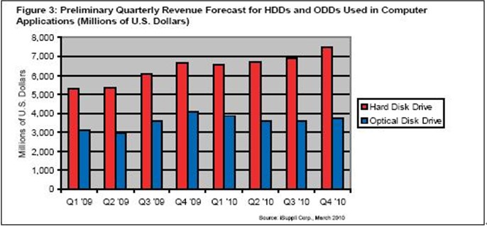據(jù)iSuppli公司,繼2009年下滑之后,預(yù)計(jì)2010年用于電腦的硬盤(HDD)和光驅(qū)(ODD)全球營業(yè)收入將增長,因?yàn)镻C出貨量將隨著全球經(jīng)濟(jì)復(fù)蘇而上升。