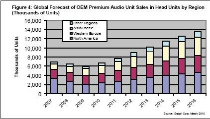 • 全球車用高端音響系統的出貨量在2010年將以兩位數速度增長
