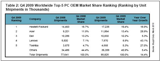 從2009年全年來看,五大PC OEM廠商中有四家增長率高于整體產業。最大廠商惠普增長7.4%。宏基、聯想和東芝分別排是第三、第四和第五大廠商,分別增長21%、14.2%和13.7%。排名第二的戴爾出貨量下降。