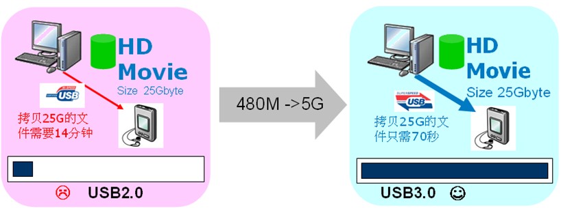 盡管USB2.0的速度已經相當快,對于目前藍光DVD、高清視頻、TB級別的大容量硬盤的數據傳輸還是有些慢,于是,在2008年11月,HP、Intel、微軟、NEC、ST-NXP、TI聯合起來正式發布了USB3.0的V1.0規范。USB3.0又稱為SuperSpeed USB,比特率高達5Gbps,相比目前USB2.0的480Mbps的速率,提高了10倍以上,如圖1所示:使用USB2.0拷貝25GB的文件需要14分鐘,而3.0只需70秒左右。 25GB,正好是單面單層藍光光盤的容量。USB3.0預計將在2011年逐漸在計算機和消費電子產品上使用。