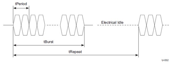 測量了Polling.LFPS信令的電壓和時間參數,在USB3.0規范CTS Rev0.9中是必測項目。測試方法為:待測試產品(PUT)的端口上插入USB3.0夾具,夾具上的TX端通過同軸電纜連接到示波器的兩個通道,將PUT上電后,PUT會發送出Polling.LFPS信令,示波器捕獲后測量其水平或垂直參數。如圖3所示為LFPS的信號特征。在力科一致性測試軟件中會分析脈沖的上升、下降時間、周期、占空比、峰峰值、共模電壓,以及脈沖串的突發持續時間(tBurst)和重復時間(tRepeat)。
