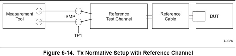 在USB3.0的TX的眼圖和抖動測試中,測量的是待測試信號經過參考測試信道后TP1點的眼圖和抖動。如圖5中的Reference test channel即為參考測試信道,在規范中定義了long channel、short channel和3米電纜三種參考測試信道。如果使用long channel或者較長電纜,信號到達接收端時衰減比較大,眼圖已經閉合,USB3.0芯片接收端使用了CTLE均衡器對信號進行均衡后,信號眼圖的質量將大大改善,所以要求測試儀器分析出CTLE均衡器處理后信號的眼圖和抖動。目前業界常用的是Intel的11英寸背板和3米USB電纜作為參考信道。