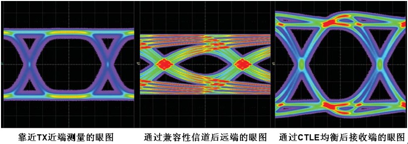 如圖6所示,左邊的眼圖是靠近TX近端測量到的眼圖;中間的眼圖是通過兼容性信道(參考測試信道)后測量的眼圖,可見眼圖的張開程度較小,抖動較大;右邊的眼圖是仿真CTLE均衡后的眼圖,可見眼高和抖動都得到改善。