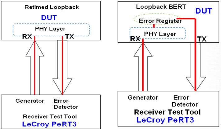 兩種測試方法對比,前者是串行信號接收端測試通常使用的傳統方法,其誤碼判定在BERT端,即在DUT的外部進行BER測試;后者是USB3.0芯片接收端直接測量誤碼率,測試儀器讀取待測試芯片的誤碼寄存器來了解誤碼值,即DUT內部進行BER測量。力科的PeRT3同時支持以上兩種測試方法。