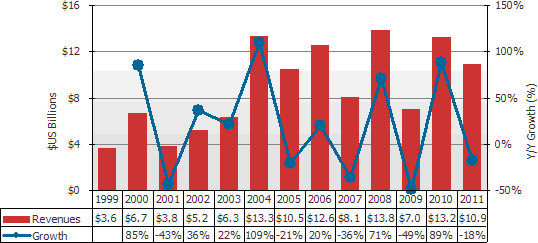圖一:1999年到2011年的TFT 液晶顯示器制造設備投資金額(單位:十億美元)