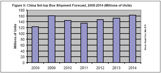 2009年中國總體機頂盒出貨量達到1.605億臺,比2008年的1.234億大增30%。iSuppli公司的圖表顯示,這些數據證明中國已成為全球最大的機頂盒生產國,以及領先的機頂盒設計中心。