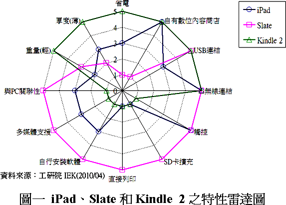 工研院IEK進行iPad、Slate和Kindle 2三種產(chǎn)品有關省電、自有數(shù)位內容商店、USB連結、無線連結、觸控、SD卡擴充、直接列印、自行安裝軟體、多媒體支援、與PC關聯(lián)性、重量(輕)和厚度(薄)等特性的競比,1分代表不具有其特性,為最低比重,分數(shù)越高代表與此特性關聯(lián)性越強,完全相關聯(lián)為最高5分,將其結果繪制成雷達圖(圖一)表示。