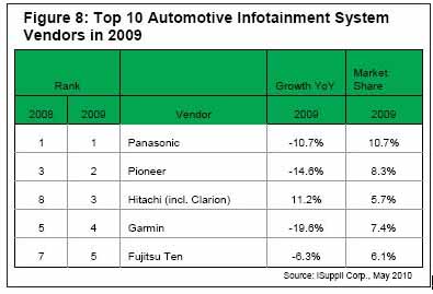 另一家日本一線供應(yīng)商日立2009年排名第三。該公司2008年排名第八,是2009年10大廠商中營業(yè)收入增長的兩家廠商之一。日立2007年與Clarion Co. Ltd.合并,合并營業(yè)收入2009年占全球信息娛樂市場的5.7%。