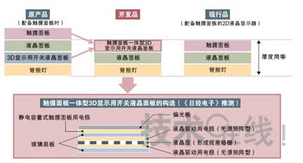 夏普的開發品將用于顯示3D映像的“開關液晶面板”與觸摸面板合為一體。該公司稱,通過這種方法,實現了與正面配備觸摸面板的現有2D液晶面板同等的厚度。(圖:上半部分根據夏普的資料制成,下半部分由《日經電子》根據采訪內容制成)