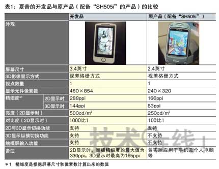 此次為了實現量產,夏普進行了以下改進:①提高了顯示性能;②實現了薄型化。①顯示性能方面,分別將影像顯示用液晶面板的精細度和亮度提高到了原來的兩倍(表1)。因此,即使進行3D顯示,最大精細度也可達到165ppi。據介紹,這是通過驅動元件(TFT)的微細化實現的。該公司稱,還通過提高兩張面板的粘合精度,減輕了左眼用和右眼用影像重疊的“串擾(Crosstalk)”現象。