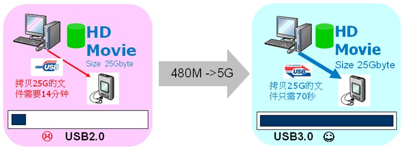 盡管USB2.0的速度已經(jīng)相當(dāng)快,對(duì)于目前高清視頻和TB級(jí)別的數(shù)據(jù)傳輸還是有些慢,在2008年11月,HP、Intel、微軟、NEC、ST-NXP、TI聯(lián)合起來(lái)正式發(fā)布了USB3.0的V1.0規(guī)范。USB3.0又稱為Super Speed USB,比特率高達(dá)5Gbps,相比目前USB2.0的480Mbps的速率,提高了10倍以上,引用Intel專家Jeff Ravencraft的話:“以25GB的文件傳輸為例,USB2.0需要14分鐘,而3.0只需70秒左右(如圖1所示)。”25GB,正好是單面單層藍(lán)光光盤(pán)的容量。USB3.0預(yù)計(jì)將在2011年逐漸在計(jì)算機(jī)和消費(fèi)電子產(chǎn)品上使用。