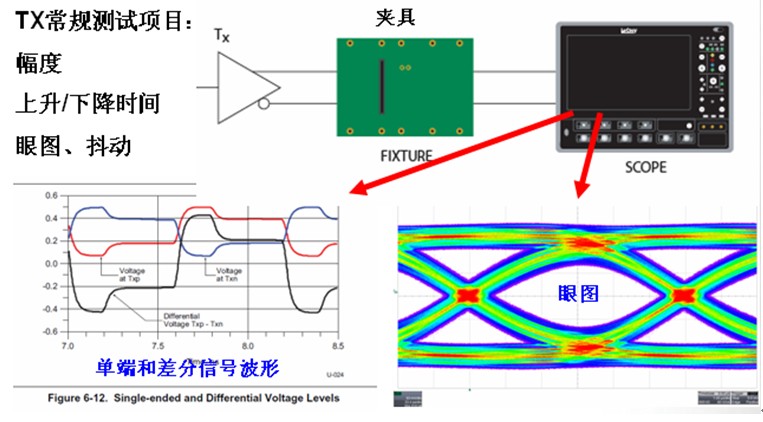 對(duì)于絕大多數(shù)高速串行信號(hào)的測(cè)量,通常包括了發(fā)送端測(cè)量和接收機(jī)測(cè)量,又稱為T(mén)X測(cè)量和RX測(cè)量。目前,對(duì)于板級(jí)設(shè)計(jì)的硬件工程師,對(duì)發(fā)送端測(cè)試已經(jīng)非常熟悉。通常使用高帶寬示波器加上測(cè)試夾具或差分探頭來(lái)測(cè)量,測(cè)試項(xiàng)目主要是眼圖、抖動(dòng)、上升/下降時(shí)間、幅度等等,探測(cè)點(diǎn)的位置一般是串行鏈路的發(fā)送端或接收端,由于測(cè)量的都是高速收發(fā)器芯片發(fā)送出的信號(hào),對(duì)于這一類測(cè)試通常都稱為發(fā)送端測(cè)試,如下圖2為典型的TX測(cè)試的示意圖。