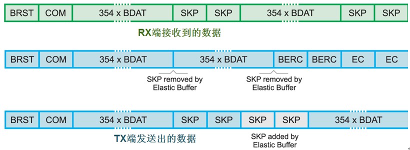 在USB3.0中,鏈路兩端的產(chǎn)品的參考時(shí)鐘頻率可能是不一樣的,參考時(shí)鐘允許的精度為+/-300ppm,SSC展頻引入的頻率偏差為0到-5000ppm,所以總的頻率偏差在-5300ppm到300ppm。為了補(bǔ)償頻率偏差,在USB3中的數(shù)據(jù)流中每354個(gè)symbol要插入兩個(gè)SKP(即K28.1碼),接收端需要能識(shí)別和刪除SKP,在USB3.0芯片中,添加和刪除SKP是由Elasticity Buffer來(lái)實(shí)現(xiàn)的(詳見(jiàn)USB3.0 Specification的6.4.3節(jié))。于是,在接收機(jī)測(cè)試時(shí),PUT發(fā)送出的碼流會(huì)加入一些SKP,誤碼檢測(cè)器接收到的數(shù)據(jù)包括了測(cè)試碼型和一些SKP,然后對(duì)比碼型發(fā)生器發(fā)送出的測(cè)試碼型,傳統(tǒng)的BERT會(huì)誤認(rèn)為測(cè)量到了誤碼。而力科的PeRT可以智能的添加和刪除SKP后,再來(lái)計(jì)算是否有誤碼。圖6為USB3.0的Elasticity Buffer處理SKP的示意圖。