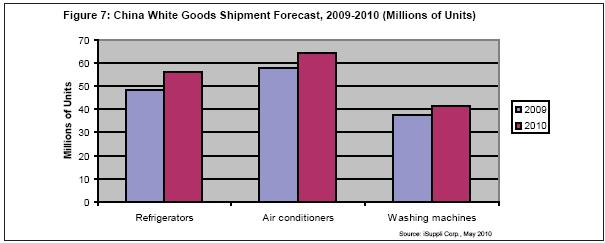 圖7所示為2009和2010年上述三大白色家電的中國市場出貨量預測。