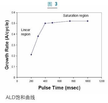 圖3中的飽和曲線(xiàn)說(shuō)明了ALD過(guò)程的自約束特性。生長(zhǎng)率隨脈沖時(shí)間呈線(xiàn)性增長(zhǎng),直到達(dá)到飽和條件。達(dá)到飽和以后,增長(zhǎng)率為常數(shù),且不再隨脈沖時(shí)間變化而變化。但是,如果同時(shí)存在一種寄生的CVD生長(zhǎng)成分或反應(yīng)物的分解的話(huà),增長(zhǎng)率就會(huì)顯著增加。因而,飽和曲線(xiàn)通常用來(lái)確定ALD的純度。ALD生長(zhǎng)速率介于每循環(huán)0.3埃到1.5埃間。雖然ALD的生長(zhǎng)速率在制備很薄的膜(<200埃)時(shí)還可以接受,但在用ALD生長(zhǎng)厚膜時(shí),生長(zhǎng)周期就成為挑戰(zhàn)。