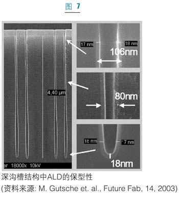 最近,Al2O3/HfO2以及Al2O3/ZrO2結(jié)構(gòu)也引起了人們的關(guān)注。PEALD也已經(jīng)用于eDRAM中。電容滿(mǎn)足所有的要求,即等效氧化層厚度要小于8埃,125攝氏度時(shí)漏電流要小于1fA/cell,工作電壓為1伏時(shí)壽命要大于十年。圖7為典型的ALD薄膜在深槽結(jié)構(gòu)的保角性和動(dòng)態(tài)存儲(chǔ)器生產(chǎn)中的半球形硅晶結(jié)構(gòu),金屬ALD薄膜,例如氮化鈦(TiN)也廣泛應(yīng)用于動(dòng)態(tài)存儲(chǔ)器制造中的電容電極。