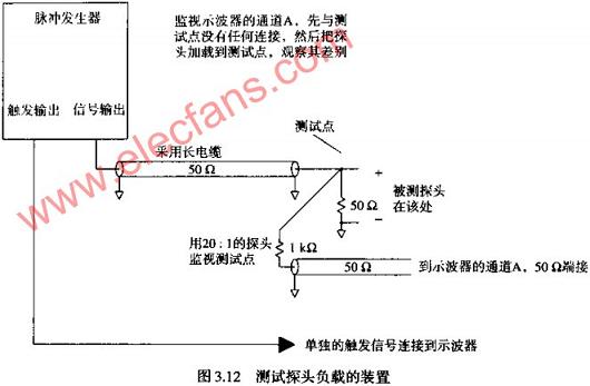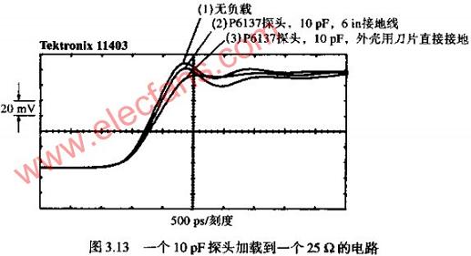 圖3.13展示了一個TEKTRONIXP6137探頭連接到測試點時的情形。P6137是一個10倍衰減,10PF的100MΩ類型探頭,應(yīng)探頭連接到400MHZ的便攜式示波器。第一個波形是沒有加載探頭時的記錄結(jié)果;第二個波形是加載了帶有6IN長接地線探頭時記錄的結(jié)果;第三個波形是將裸探頭的尖端觸點直接接觸測試點A,探頭外殼用刀片直接接地時得到的結(jié)果。