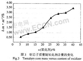 對于二步法生產工藝,單體為聚合反應過程中的過量一方,聚合物生成的量由氧化劑的量來決定,聚合物在鉭芯表面的沉積數量隨氧化劑含量的增加而增加。從圖3可以看出,在相同的浸漬次數下,使用含量為5%的氧化劑陽極塊的質量增加為0.54%,而使用含量為40%的氧化劑陽極塊質量增加為3.52%,因此高含量的氧化劑可以有效增加聚合物的沉積量。